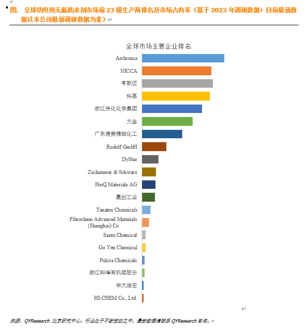 根据QYResearch头部企业研究中心调研,全球范围内纺织用无氟防水剂生产商主要包括Archroma、NICCA、亨斯迈、科慕、浙江传化化学集团等。2023年,全球前五大厂商占有大约45.0%的市场份额。