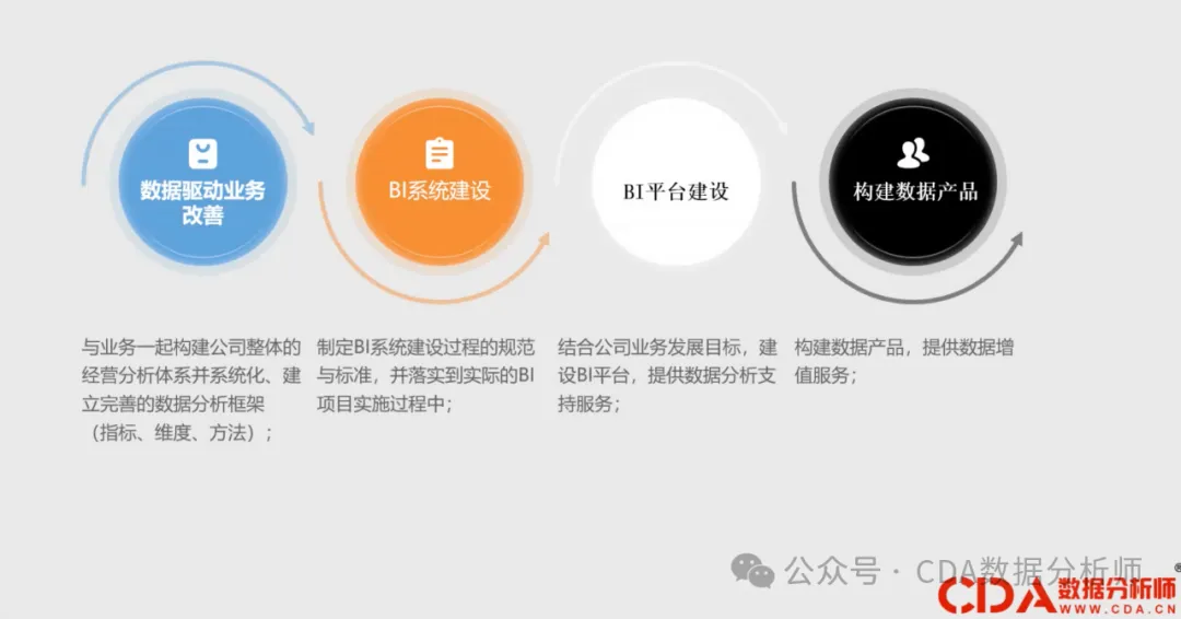 完成以上三步后,我们去开发最终的数据产品。无论形式如何,我们的目标是为用户提供一套完整的数据分析解决方案。简而言之,我们的工作是确保数据分析过程的系统化和高效,以便为业务决策提供支持。