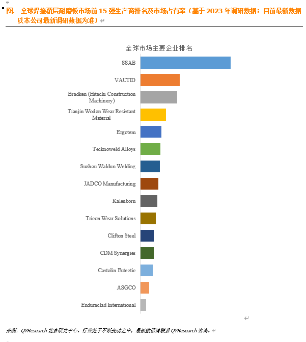 根据QYResearch头部企业研究中心调研,全球范围内焊接覆层耐磨板生产商主要包括SSAB、VAUTID、Bradken (Hitachi Construction Machinery)、Tianjin Wodon Wear Resistant Material、Ergotem等。2023年,全球前五大厂商占有大约44.0%的市场份额。