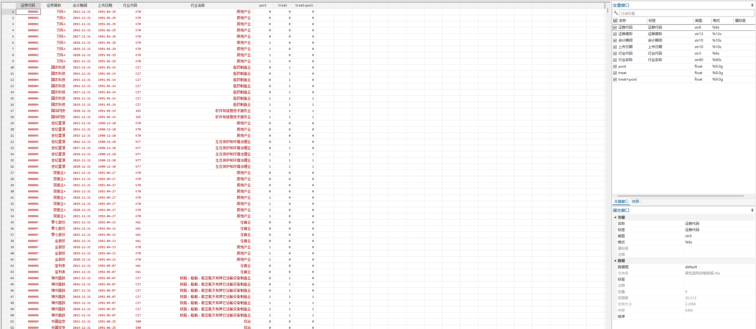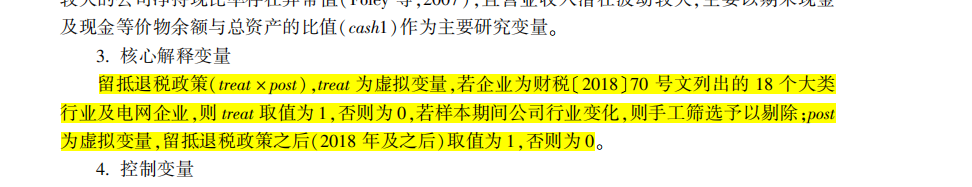 2000-2021上市公司留抵退税政策数据:累计涵盖2w+观测值数量,超2400+样本企业!包括treat变量、post变量、treat×post交互项重要变量的详细数据!指标测度方法说明:留抵退税政策(terat×post),treat为虚拟变量,若企业为财税〔2018〕70号文列出的化学原料及化学制品制造业、医药制造业、化学纤维制造业等18个大类行业及电网企业,则treat取值为1,否则为0,若样本期间公司行业变化,则手工筛选予以剔除;post为虚拟变量,留抵退税政策之后(2018年及之后)取值为1,否则为0。