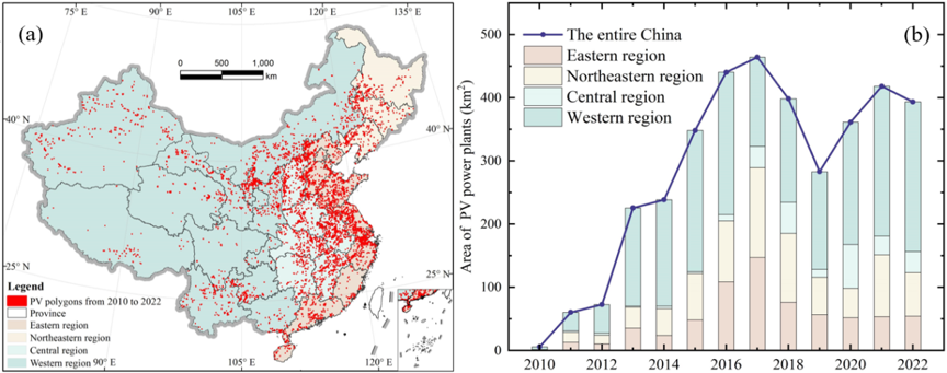 图2.中国光伏电站空间时空扩张格局.(a)空间分布和(b)年度变化.