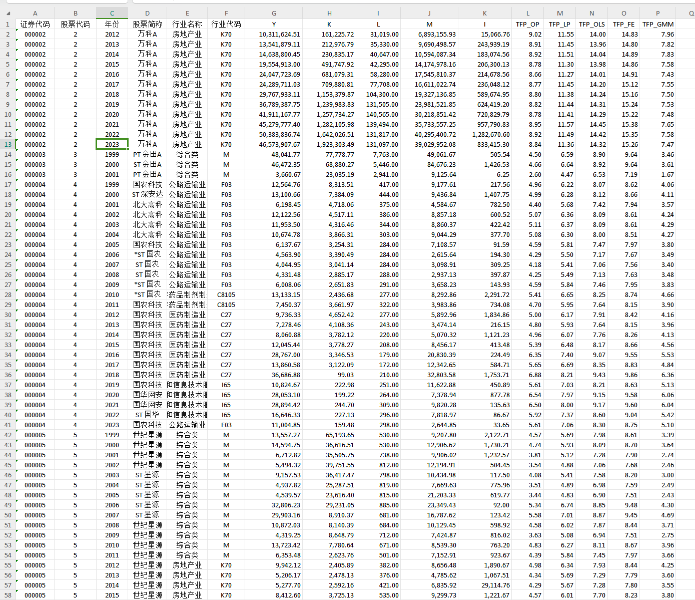 数据指标:证券代码、year、TFP_OLS、TFP_FE、TFP_LP1、TFP_OP、TFP_OPacf、TFP_GMM
