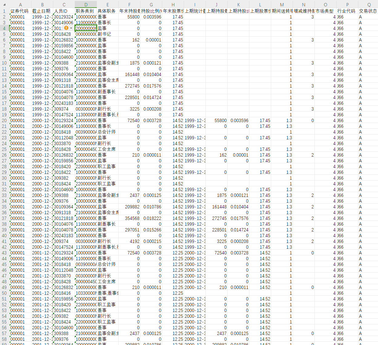 证券代码 截止日期 姓名 人员ID 职务类别 具体职务 年末持股数 持股比例(%) 年末股票价格 上期统计截止日期 上期持股数量 上期持股比例(%) 上期股票价格 期间送转增配股比例 增减维持新进标识 市场类型 行业代码 交易状态