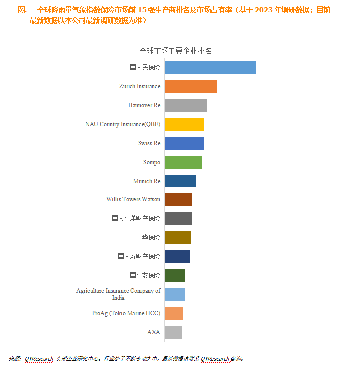 全球范围内,降雨量气象指数保险主要提供商包括中国人民保险、Zurich Insurance、Hannover Re、NAU Country Insurance(QBE)、Swiss Re、Sompo、Munich Re、Willis Towers Watson、中国太平洋财产保险、中华保险等。2023年,全球前十强厂商占有大约56.0%的市场份额。