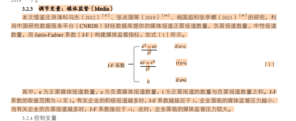- J-F系数是一个介于-1到1之间的数值,用于表示媒体监督的偏向性。当J-F系数接近1时,表示媒体对企业的正面报道较多,企业面临的媒体监督压力较小;而当J-F系数接近-1时,则表示媒体对企业的负面报道较多,企业面临的媒体监督压力较大。
