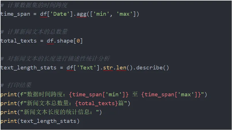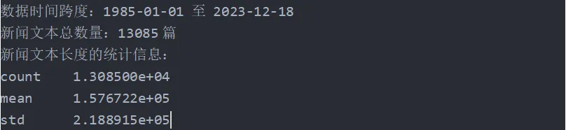 •标准差:约218,891字,标准差较大,意味着新闻长度的分布非常广泛,既有非常短的新闻,也有长篇报道,体现了内容的多样性。