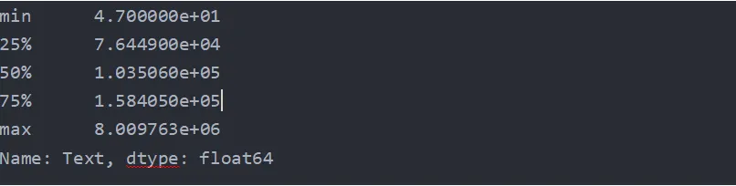 •分位数:根据四分位数(25%, 50%, 75%)数据,我们可以看出超过一半的新闻文本长度在76,449至158,405字节之间,显示出一定的集中趋势,但同时也有极端值,如最小值(min)47字节和最大值(max)8,009,763字节,表明部分新闻或许仅为简讯,而某些新闻则可能是详细的专题报道或系列文章