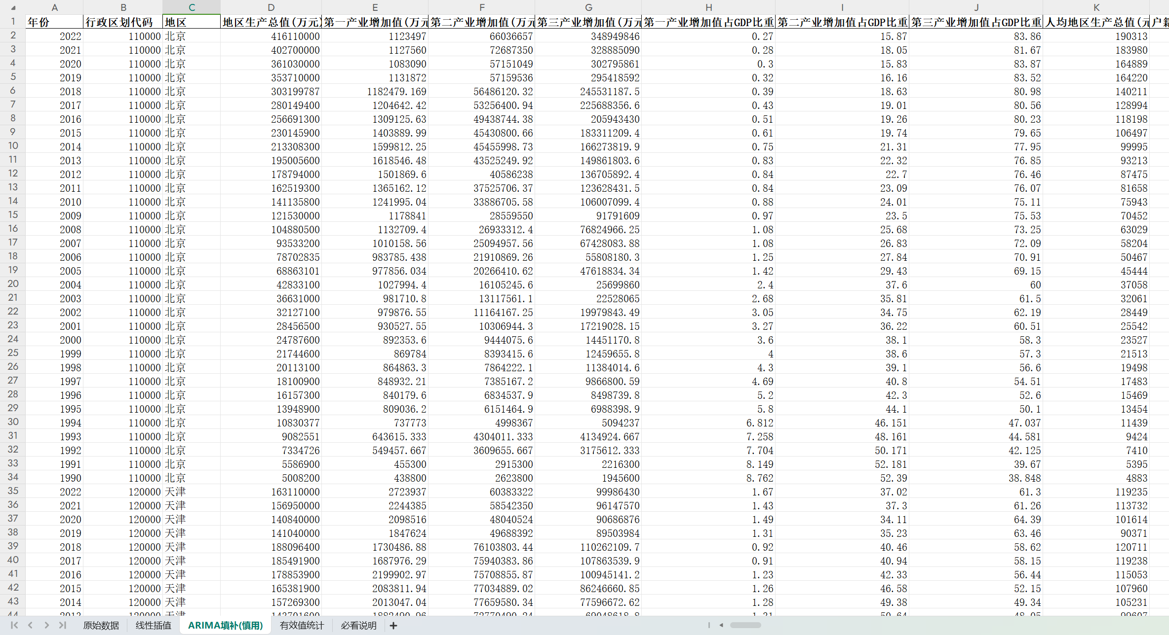 第九,ARIMA填补。利用时间趋势,对剩余缺失进行预测,得到ARIMA填补版