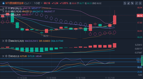 【原油技术面分析】:原油市场上周五开盘在68.11美元/桶,后行情回踩67.93美元/桶,后行情直接拉升,日线最高触及到了68.45美元/桶,后行情冲高回落,日线最终收线在了68.66美元/桶,后行情以一根上影线很长的中阳线收线,油价低位调整中。原油4小时级别显示,油价继续区间震荡,原油先涨后跌,布林轨平行,如果油价无望向上突破,大概率将延续回落格局。 综合以上分析:今日操作思路上以反弹高空为主,回踩低多为辅,上方短期关注69.0-68.5一线阻力,下方短期关注67.0-65.5一线支撑。