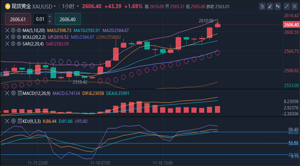 【黄金消息面分析】:周一(11月18日)现货黄金市场迎来显著波动,金价上涨1.58%,报2610.00美元/盎司,单日涨幅扩大至22美元。过去六个交易日的跌势暂时被打破,但技术和基本面信号表明反弹空间可能受限。