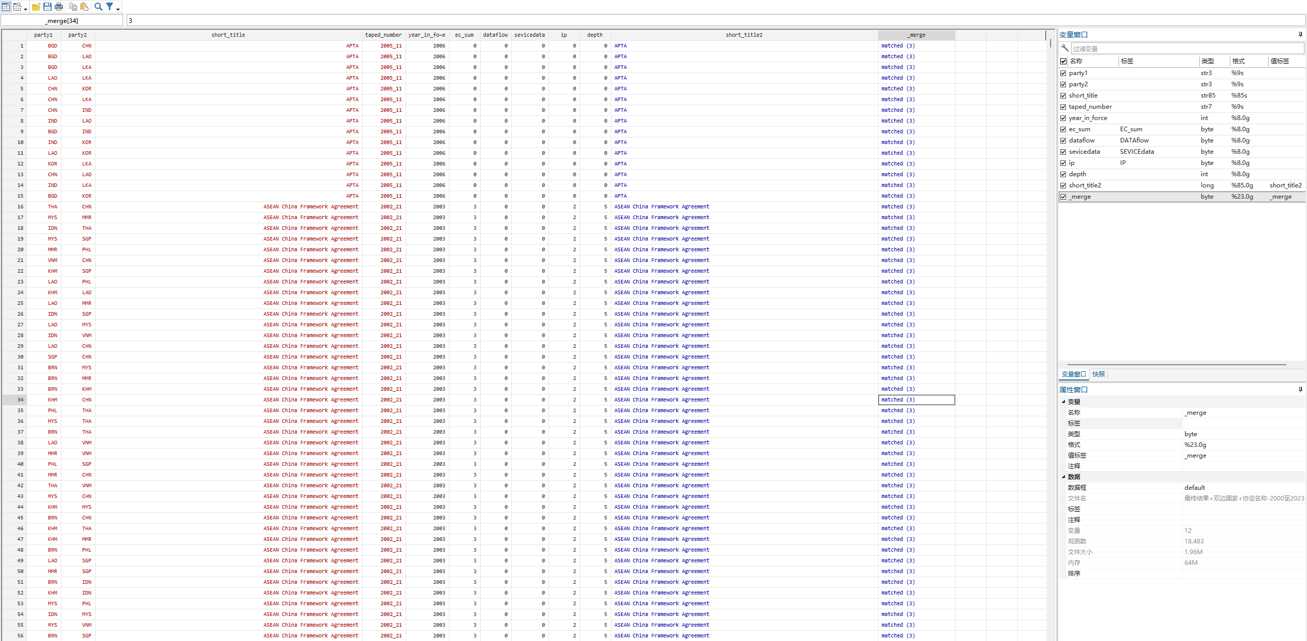 3.若有其他测算方法或需要按“签署”年份计算,可自行测算,并匹配到《双边国家+协定名称-2000至2023全部协定.dta》中,merge,按short_title匹配。