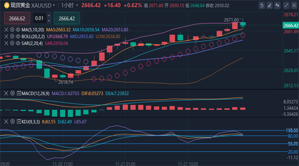 [黄金消息面分析]:周四(11月21日),现货黄金延续近期涨势,交投于2665.91美元/盎司,日内涨幅0.60%。黄金价格连续四天上涨,触及一周多以来的高点。当前市场围绕避险需求和美联储政策前景的双重因素展开博弈,市场情绪显得复杂而多变。