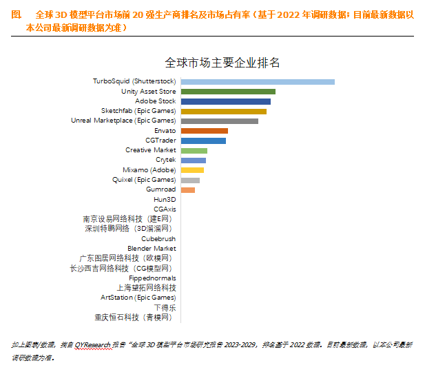 全球范围内3D模型平台的主要生产商包括TurboSquid (Shutterstock)、Unity Asset Store、Adobe Stock、Sketchfab (Epic Games)、Unreal Marketplace (Epic Games)、Envato、CGTrader、Creative Market、Crytek、Mixamo (Adobe)等。