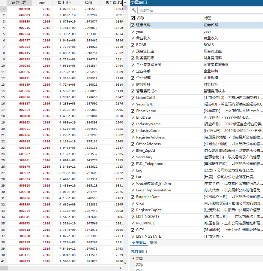 证券代码、年份、营业收入、ROAB、现金流比率、财务费用率、企业要素密集度、企业年龄、企业规模、财务杠杆、管理费用成本、上市公司ID、证券ID、股票简称、年度区间、行业名称、行业代码、注册具体地址……45个指标不一一列举