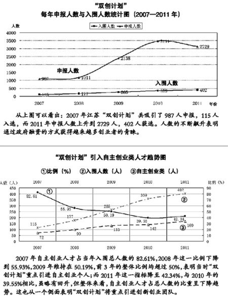 从2007年的1亿到2011年的4亿,江苏省对“双创计划”的资助力度不断加大;从2007年的115人到2011年的402人,入围人数的增幅接近250%,给江苏的人才队伍建设注入了新的动力。