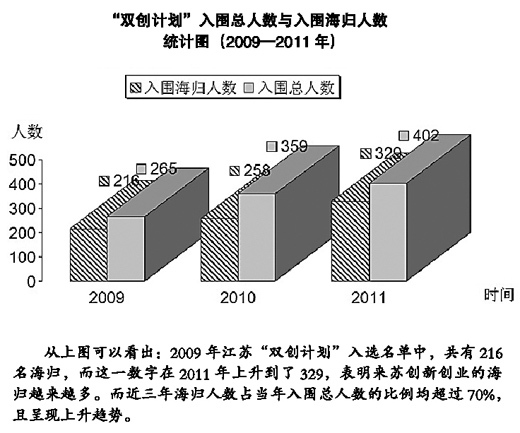 从江苏省委组织部人才工作处获悉,2009年有216名海归入围“双创计划”,占当年总人数的81.51%;2010年这个数字上升到258,占总人数的71.87%。今年的入选者中,329人拥有海外留学或工作经历,占总人数的81.84%,两项指标均创历史新高。