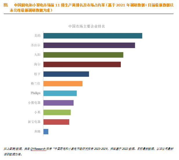 中国范围内厨电和小家电生产商主要包括Meidi、Suboer、Jiuyang、Haier、Songxia、Gelanshi、Philips、Xiaoxiong、Xiaomi、Xinbao等。2022年,中国前五大厂商占有大约29.0%的市场份额。
