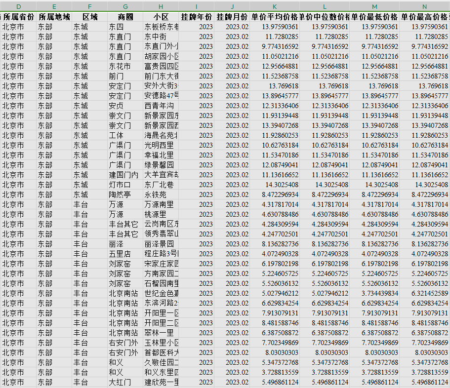 序号,行政区划代码,所属省份,所属地域,区域,商圈,小区,挂牌年份,挂牌月份,单价平均价格,单价中位数价格,单价最低价格,单价最高价格,总价平均价格,总价中位数价格,总价最低价格,总价最高价格。