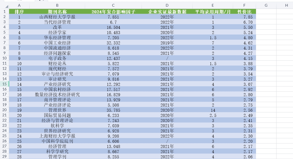 整理收集了100本经管类CSSCI期刊(部分扩展版)的发表性价比,性价比=2024年复合影响因子÷平均录用周期,供大家参考
