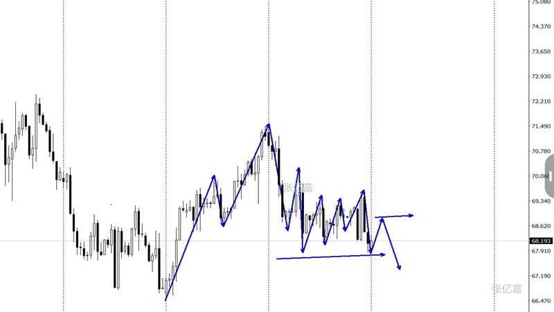 原油市场上周开盘在71.365美元/桶,后行情小幅拉升给出71.54美元/桶,后行情强势回落,周线最低给到了67.95美元/桶,后行情整理,周线最终收线在了68.096美元/桶,后行情以一根略带影线的大阴线收线,而这样的形态收尾后,原油延续看跌思路。四小时级别上看,在空趋势下近期走了低位横盘,短线形成矩形震荡,在高点持续压制下,低点多次试探,试探的越多破位的概率也就越大。原油震荡区间下移,有望打开下行空间。综合以上分析,张亿富认为:原油冲高回落,下破前低,空头有望延续,今日操作上考虑反弹做空为主,低多为辅,上方关注68.6-69.6美元阻力,下方关注67.0-66.5美元支撑。