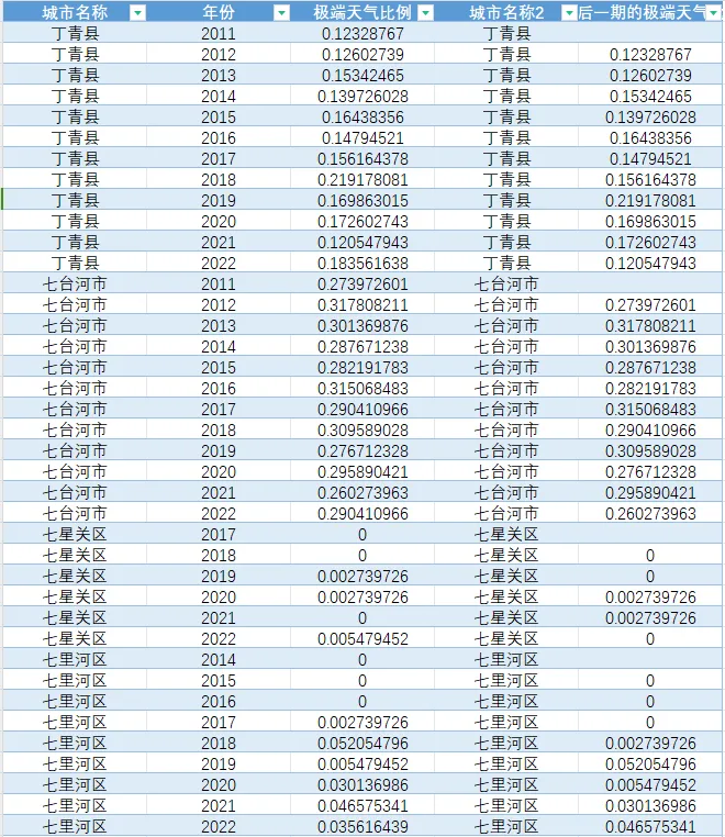 - 主要指标:城市名称、日期、最高气温、最低气温、天气情况、年份、极端气温(包括极端高温与极端低温)、极端降水量、极端天气占比、以及滞后一期的极端天气占比等。