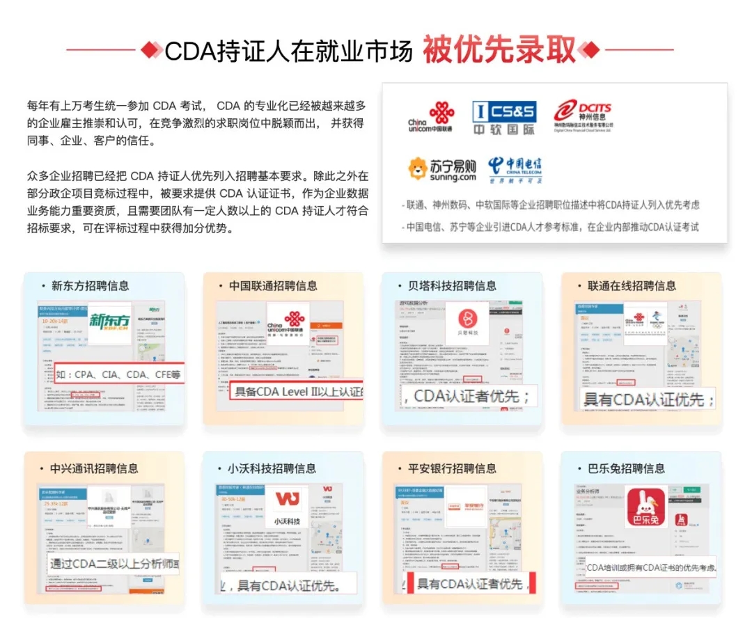 CDA数据分析师考试对于求职很有帮助。在刷招聘软件的时候可以看到,很多企业在招聘时会注明CDA数据分析师持证人优先。这个证书含金量比较高,非常建议考过。