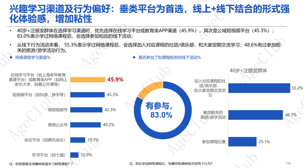 此外,高层级需求对个性化体验要求高,垂类在线学习平台能够根据40岁+泛银发群体的学习习惯和兴趣偏好推荐合适的课程内容,实现个性化学习以及线下定制化体验服务。这种定制化的服务让40岁+泛银发群体感受到更多的关注和尊重,提高了他们的学习积极性和满意度。这是公域平台所不具备的业务特色。NewAgingPro团队调研发现,超八成在线兴趣学习用户会选择参加相应的线下活动,比如加入课程俱乐部(55.3%),参加线下游学(48.6%)等,线上线下融合的业务模式能够进一步增强用户体验感,增加用户粘性,也是深度用户运营的有效方式。