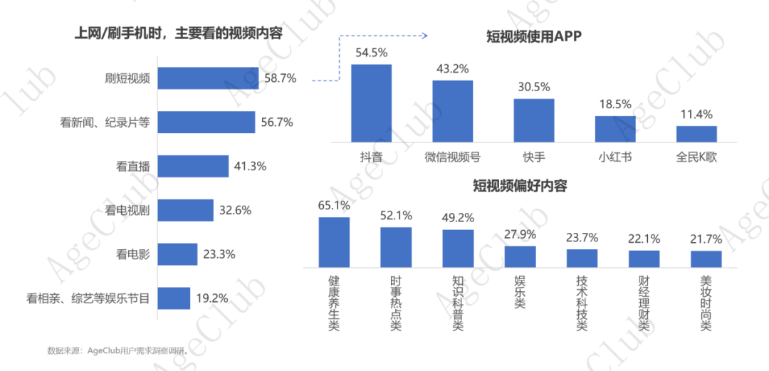 精神追求方面,以刷短视频为例,抖音、微信视频号、快手、小红书等TOP级短视频分享型APP。观看内容涉及日常的方方面面,主要以健康养生类(65.1%)、时事热点类(52.1%)、知识科普类(49.2%)为主。这些短视频分享型APP不仅为40岁+泛银发群体提供了多样性的的短视频内容,也成为了他们获取信息、社交互动、学习新知及情感寄托的重要渠道。