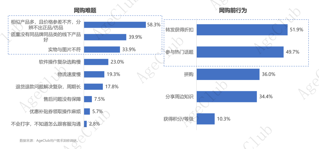 日常网购中,各类电商平台虽然操作便捷,品类齐全,但相对于年轻人,40岁+泛银发群体信息分辨能力不够,消费决策干扰因素过多,如相似产品多,且价格参差不齐,分辨不出正品/仿品(58.3%),质量没有同品牌同品类的线下产品好(39.9%),实物与图片不符(33.9%)等难题,最终造成的结果就是消费体验差,消费热情度下降,这是公域平台或垂类平台难以涉及的领域,因此银发KOL/KOC模式应运而生。