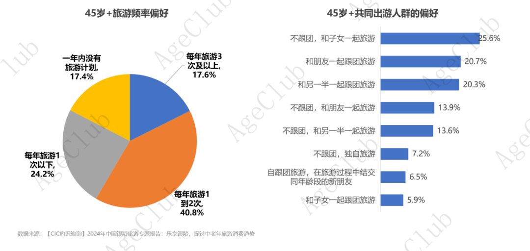 量子之歌《2024年中国银龄旅游专题报告》显示,17.6%的中老年群体每年旅游3次及以上,40.8%的中老年人每年旅游1到2次。中老年群体旅游需求旺盛,且呈现出随着年龄增长,旅游欲望愈发强烈的特征;另一方面,不跟团独自旅游和独自跟团旅游仅有7.2%和6.5%的中老年消费者选择,反映出了中老年群体喜欢结伴出游的特性。社交需求日益增强。银发旅游旅居场景已成为线下银发新场景的“流量聚集地”。