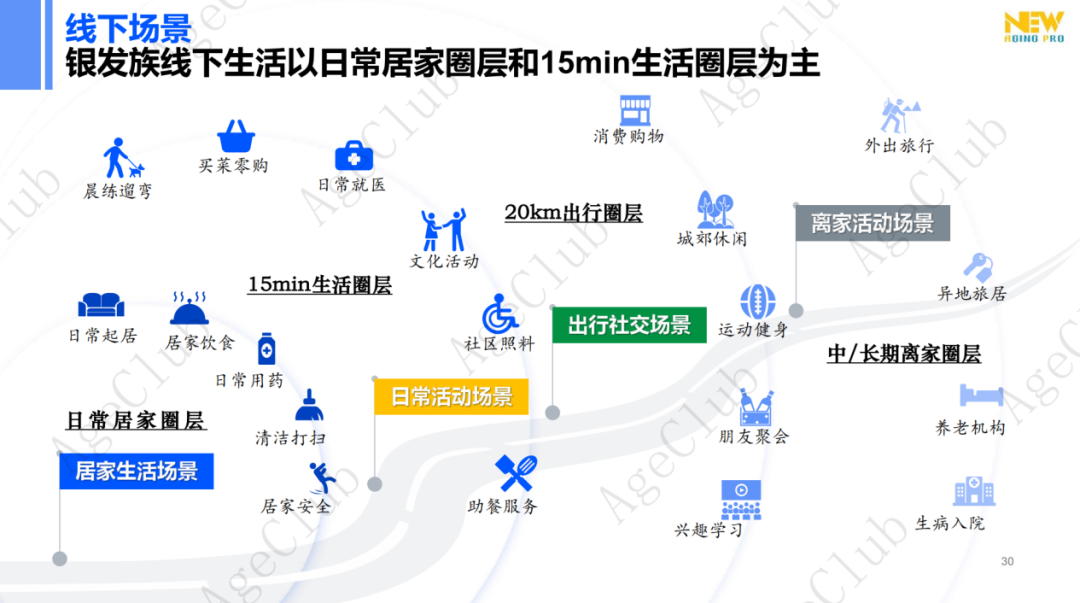 线下渠道发展表现为传统场景做口碑,银发新场景做体验消费。40岁+泛银发群体线下生活多以日常居家圈层和 15 min 生活圈层为主,包括户外公区、连锁药店、连锁商超、连锁零售等传统场景,是老年人日常生活中经常接触的地方。进一步的体验型和个性化需求,需要依赖银发新场景来满足。
