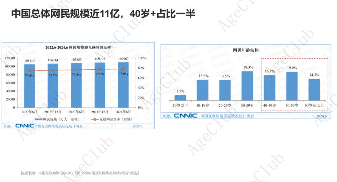 40岁+网民群体占比显著增长。中国互联网络信息中心《第54次中国互联网络发展状况统计报告》数据显示,截至 2024年6月,我国网民规模近11亿人(10.9967亿人),较2023年12月增长 742万人,互联网普及率达78.0%,较2023年12月提升0.5个百分点,其中40岁+网民占比为50.0%,50 岁及以上网民群体占比由 2023年12月的 32.5%提升至 33.3%,互联网进一步向中老年群体渗透。