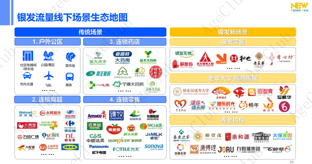 银发新场景是指专门针对40岁+泛银发群体的线下消费和活动空间,这些渠道旨在满足中老年人的购物、休闲、饮食、娱乐、社交等需求。银发新场景的特点是需求精准度高、业务内容与用户需求高度匹配,重体验感,是线下的【银发专属空间】,典型的消费场景包括银发零售、老年大学、旅游旅居、养老机构等。