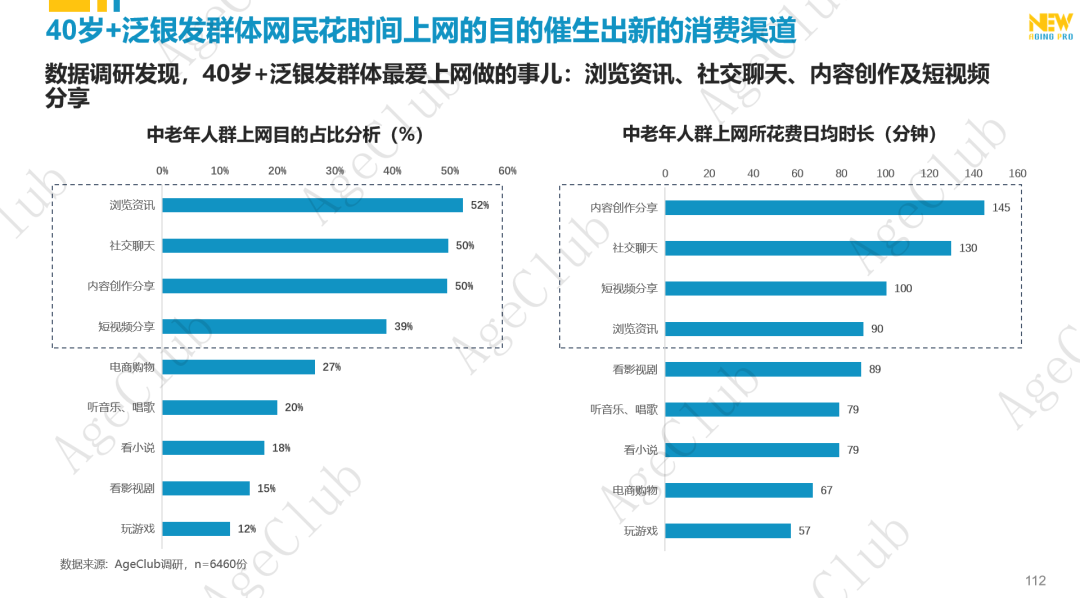 40岁+泛银发群体积极拥抱互联网,构建线上生活新方式。NewAgingPro团队调研发现,40岁+泛银发群体平均每天上网3.0小时,51.6%平均每天上网1-3小时,占比最高,互联网已成日常生活必备;而互联网释放了40岁+泛银发群体的潜在需求,他们在网上与世界保持实时互联(浏览资讯52%),拓展社交圈/结交同好(社交聊天50%、内容创作分析50%、短视频分享39%),享受购物乐趣(电商购物27%) 等,多样化需求得到很好的满足。