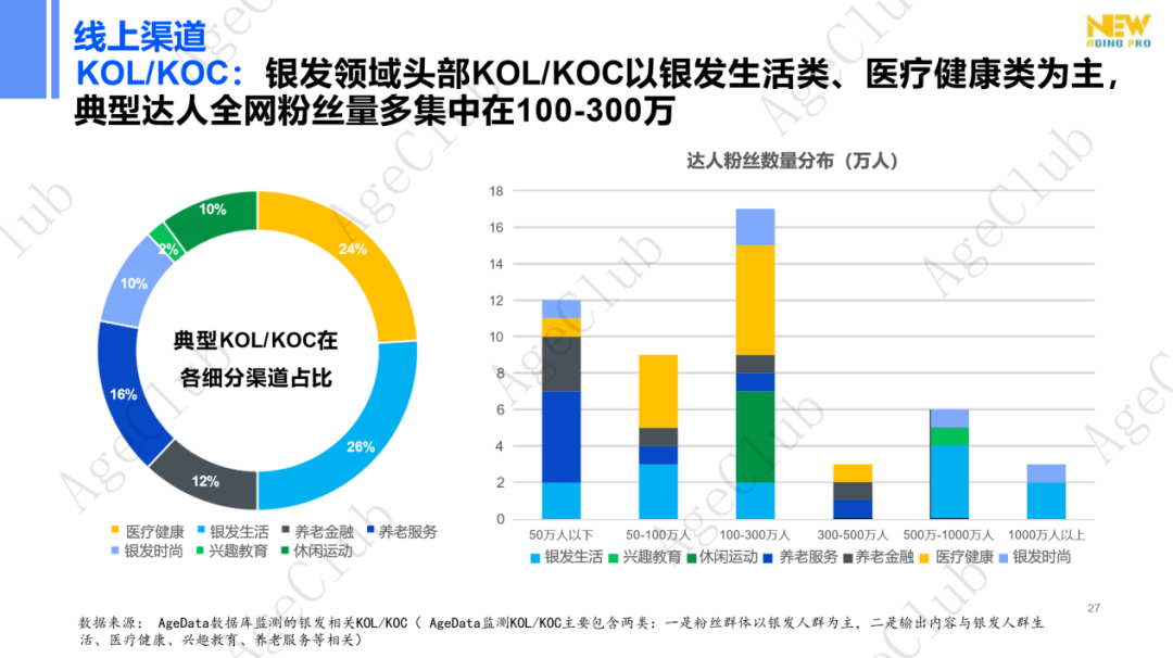 银发KOL/KOC的运营模式一般是在某一细分领域内通过图文、短视频这类可视化有声音的传播方式打造内容社区,吸引粉丝加入,形成一定流量池后,通过种草、直播带货模式变现。银发生活类、健康养生类内容需求度相对更高,也是主要银发头部KOL/KOC的发力领域。