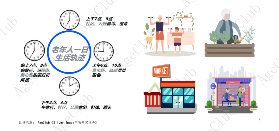 社区、公园、商超、菜市场是线下触达老年人最有效的途径。15min生活圈层主要还是围绕自己的日常生活需求展开,这个圈层的特点是离家近、熟人多。相应地,社区型渠道就成为了最高效的选择。