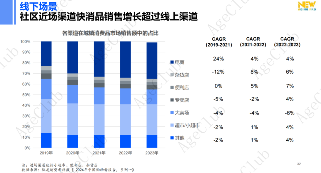 社区近场渠道快消品销售增长超过线上渠道。社区近场渠道包括小超市、便利店、杂货店。凯度消费者指数《2024年中国购物者报告,系列一》数据显示,社区近场渠道连续两年的CAGR(复合年均增长率)均为正值,充分体现了“小店经济”的潜力与活力。依靠着满足“社区流量”的微消费、零碎消费需求,社区近场渠道与40岁+泛银发群体建立了强信任关系,使得40岁+泛银发群体特别是高龄群体更愿意在这些场所购物,并形成稳定的消费习惯。