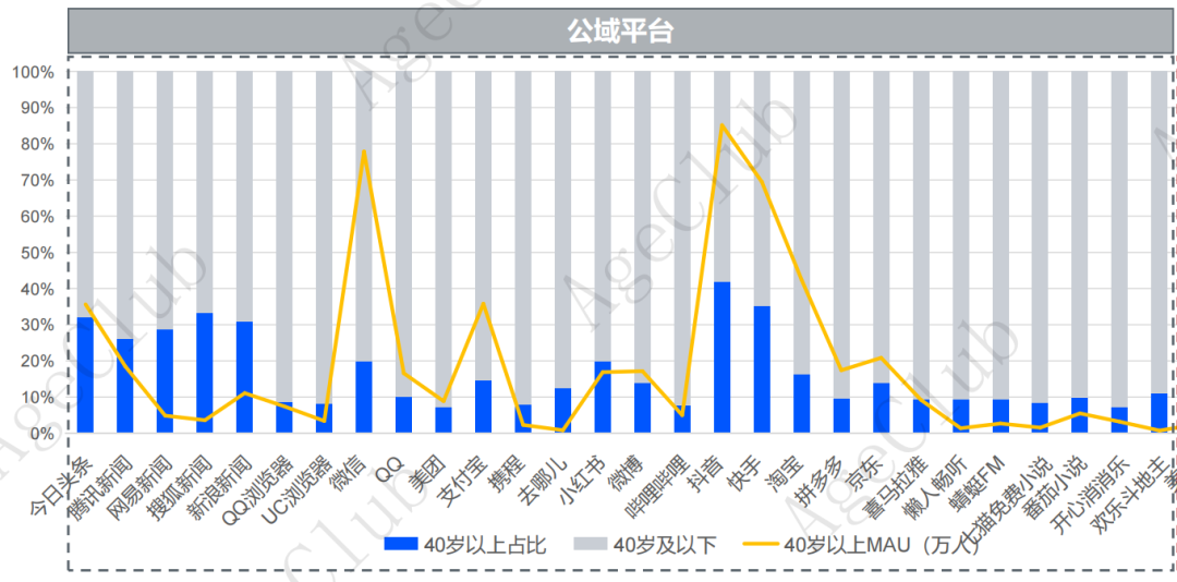 因此我们看到,满足了全龄层生活便捷度和精神追求的提升需求的亿级公域平台,同样成为了40岁+泛银发群体的主要活跃场景,其中以微信(日常社交通讯类APP,提升沟通效率)、抖音(涵盖了从生活窍门、健康知识到娱乐八卦、历史人文等各类视频,满足了中老年人对精神层面的多样化需求)为首的公域平台,40岁+泛银发人群占比多在30%以下,但用户规模大。内容全覆盖、用户跨度广、用户基数大是公域平台的突出优势,也成为银发赛道企业在线上投流获客、提升产品/品牌影响力的优选渠道。