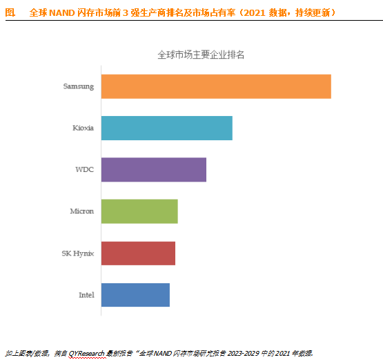 全球范围内NAND闪存生产商主要包括Samsung、Kioxia(铠侠)、WDC(西部数据)、Micron等。2021年,全球前三大厂商占有大约68%的市场份额。这些公司在技术、产品、市场份额等方面均有一定的优势,竞争激烈。