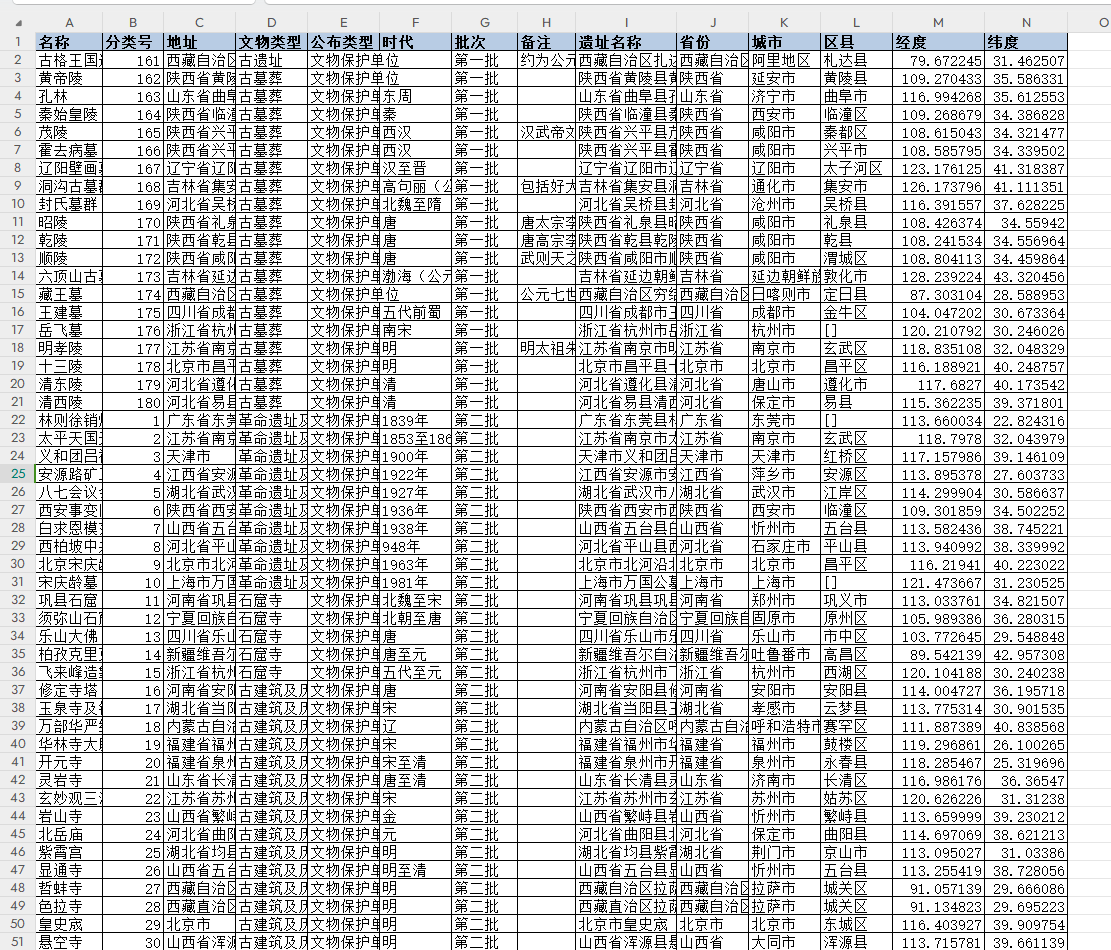 名称、分类号、地址、文物类型、公布类型、时代、批次、备注、遗址名称、省份、城市、区县、经度、纬度