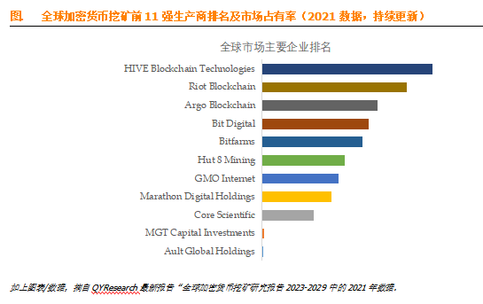 全球范围内加密货币挖矿生产商主要包括Ault Global Holdings、MGT Capital Investments、Core Scientific、Marathon Digital Holdings、GMO Internet、Hut 8 Mining、Bitfarms、Bit Digital等。