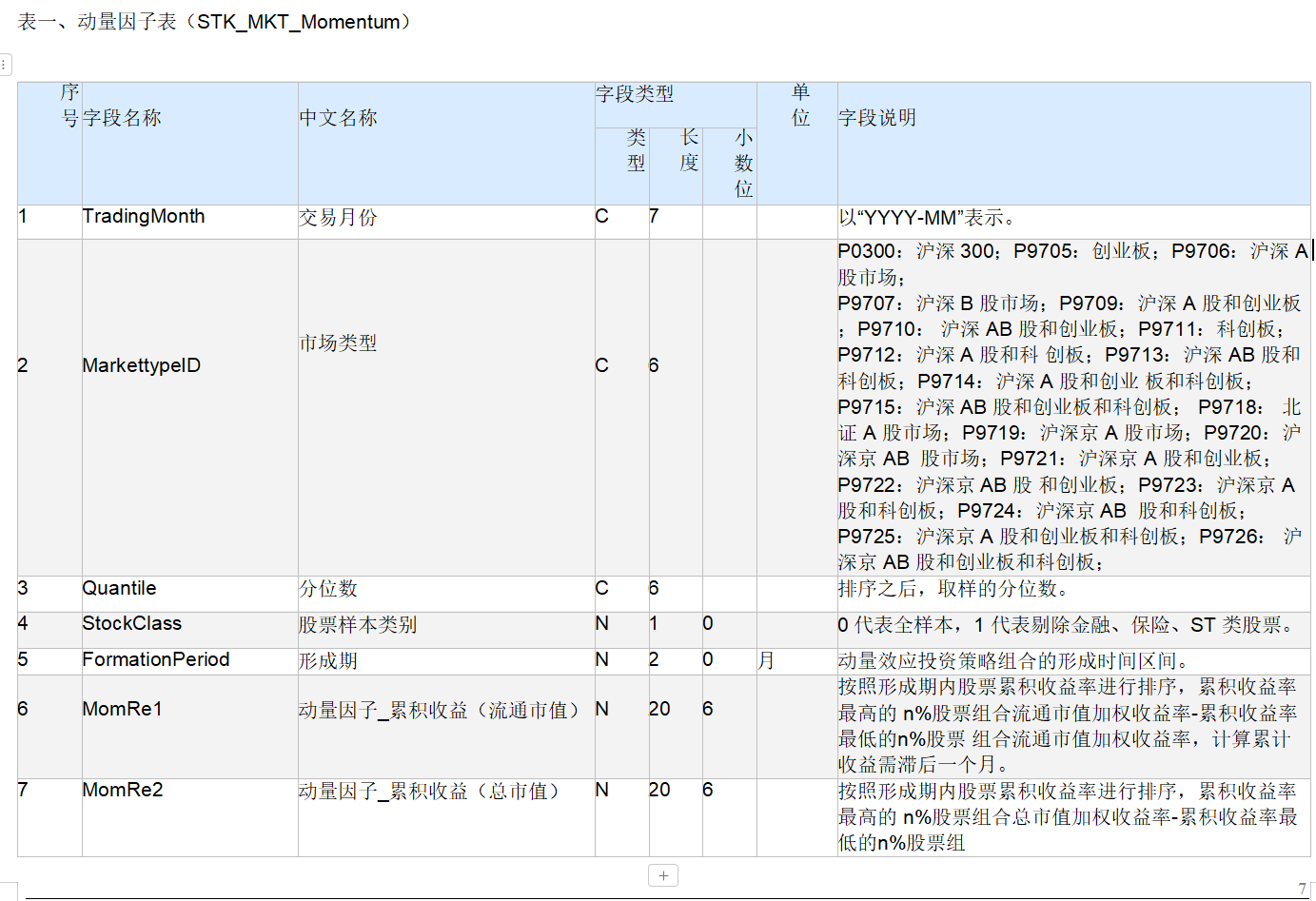 1 | 动量因子表 | 记录了各种类型的股票动量因子。 | 11 | 1994~ | 月 |
