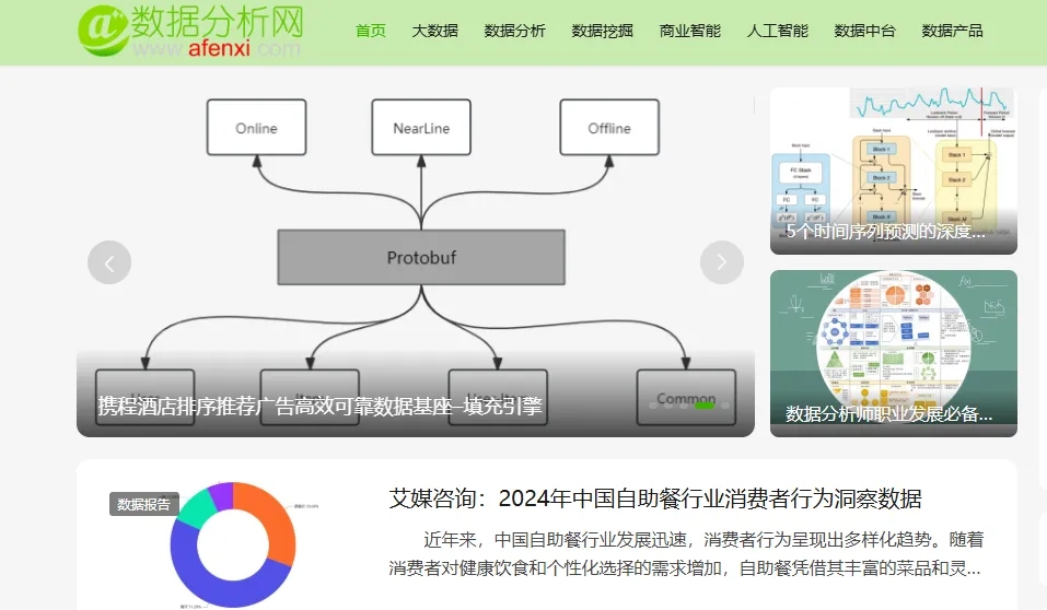 数据分析网站afenxi主要内容包括:大数据相关的最新的资讯、业内人物的点评文章、数据分析相关的技术文章、大量的数据分析的相关免费的学习资源以及相关的线下线上活动。