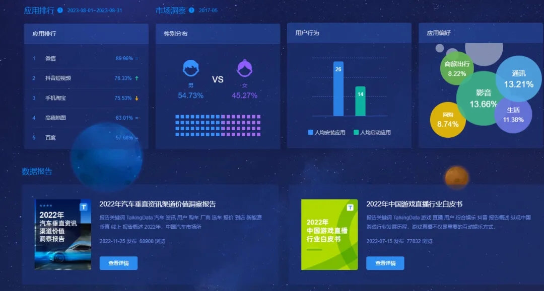 移动观象台是TalkingData推出的移动端大数据查询平台,主要服务于移动应用开发者、市场研究人员和数据分析师。