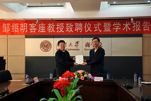 南开新闻网讯(通讯员 杨建梁)1月5日,国际知名国际商务与营销学者、美国密苏里大学邹绍明教授受聘南开大学客座教授。南开大学副校长朱光磊向他致送聘书。致聘仪式由商学院院长张玉利教授主持。
