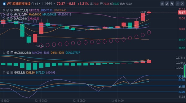 【原油消息面分析】:布伦特原油连续合约报73.94美元/桶,日内上涨0.82%;美原油连续合约交投于70.61美元/桶,日内上涨0.84%。本周油价在经历震荡后小幅收高,主要受到中东供应风险缓解和市场对需求担忧减弱的支撑。