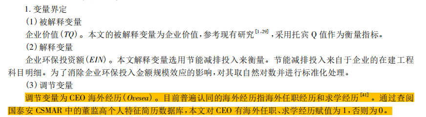 调节变量为 CEO 海外经历( Ovesea) 。目前普遍认同的海外经历指海外任职经历和求学经[41]。通过查阅权威数据库 中的董监高个人特征简历数据库,本文对 CEO 有海外任职、求学经历赋值为 1,否则为 0。