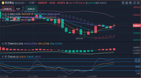 【黄金技术面分析】:金昨日整体波动不大,早盘探底2643一线后开启震荡慢涨,欧盘最高上涨到2664一线,美盘震荡回落,收盘略高于开盘价,日线收一根小阳十字星,行情短线进入震荡整理,日线连阴未能延续,不过十字星的出现仍然有着中继看跌作用,日线布林带走平,K线处于短期均线下方,5均线拐头向下,短线2670之下看震荡偏空运行,去测试下轨2603附近支撑。黄金4小时图昨日早盘三连阳后并没有延续向上,日内整体呈横向整理,ma5与ma10粘合走平,布林带延续向下有收口迹象,短线继续看震荡整理,看作前面下跌后的修正,区间关注中轨2670及下轨2627,1小时布林带走平,短线思路依旧是震荡偏回落,只是节奏稍微缓慢。综合来看,今日黄金短线操作思路上反弹做空为主,回调做多为辅,上方短期重点关注2655-2660一线阻力,下方短期重点关注2635-2630一线支撑。