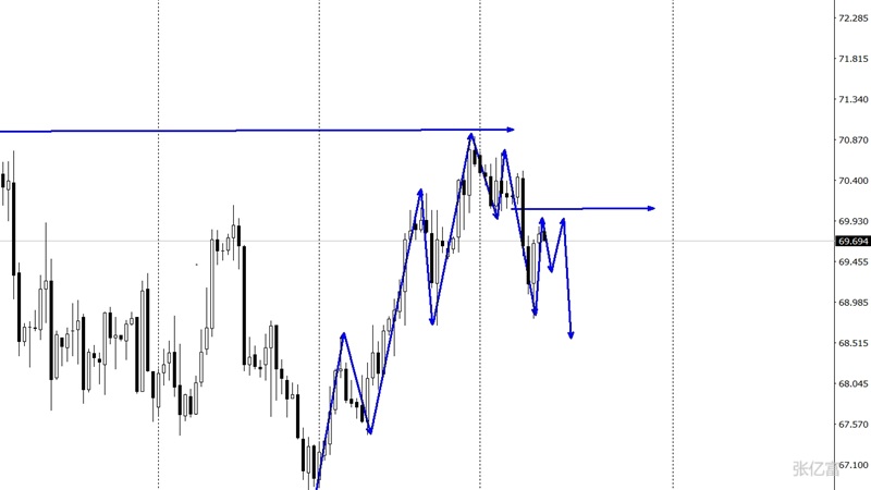 原油周二出现了高开低走走势,在70.7美元一带遇阻后承压会跌,最低点触及68.8美元一带企稳徘徊,最后收盘在69.77美元一线。日线级别最终收录一根阴线锤头线,下影线较长,在四连阳之后出现了二连阴,进一步表明了油价在考验支撑,后市依旧考虑承压为先。四小时级别上看,布林带处于一个震荡走平迹象中,油价在触及上方阻力位之后油价震荡回落,运行了一个之字型回落,目前主要关注空头形态是否延续,重点关注69.8-70.5是否延续承压。综合以上分析,张亿富总结:油价高位承压之后运行在次区间震荡,今日操作上考虑反弹做空为先,低多为辅,上方关注69.8-70.5美元阻力,下方关注68.8-68.0美元支撑。