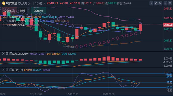 【黄金消息面分析】:周三(12月18日)欧盘时段,COMEX黄金交投于2650美元附近,基本面上周四凌晨美联储利率决议即将落地,目前市场已经完全定价25BP降息预期,因此即使降息落地,对于金价的助涨作用也相对有限。